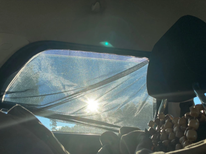 Ein herrlicher Morgen. Wunderbare Ruhe. Die Sonne steht schon über den Bäumen und scheint mir ins Auto.