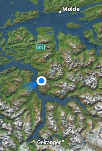 Die Hochseekreuzer schlängeln sich im Fjord bis dort hin, hab heute schon ein Schiff gesehen. Im Moment ist es zu diesig. Vielleicht reicht‘s morgen für ein schönes Bild.