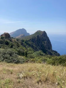 Capo Rosso ist der Felsen im Hintergrund. Der Granit hat hier eine rötliche bis tiefrote Färbung. Deswegen heißt dieses Ding eben Rotes Kap.