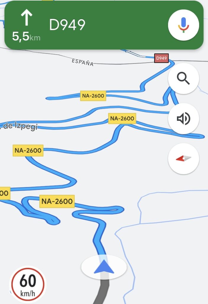 Weiter Richtung Frankreich (43° 00.0764′ N, 01° 39.7262′ W) Das Navi lotst mich über Straßen korsischen Charakters in die Berge hinauf.