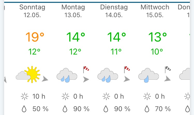 Wie wird denn das Wetter heute? Durch und durch angenehm. Und nächste Woche … 😮 Oh je, hätt ich lieber nicht gekuckt! Montag will ich auf die Insel.