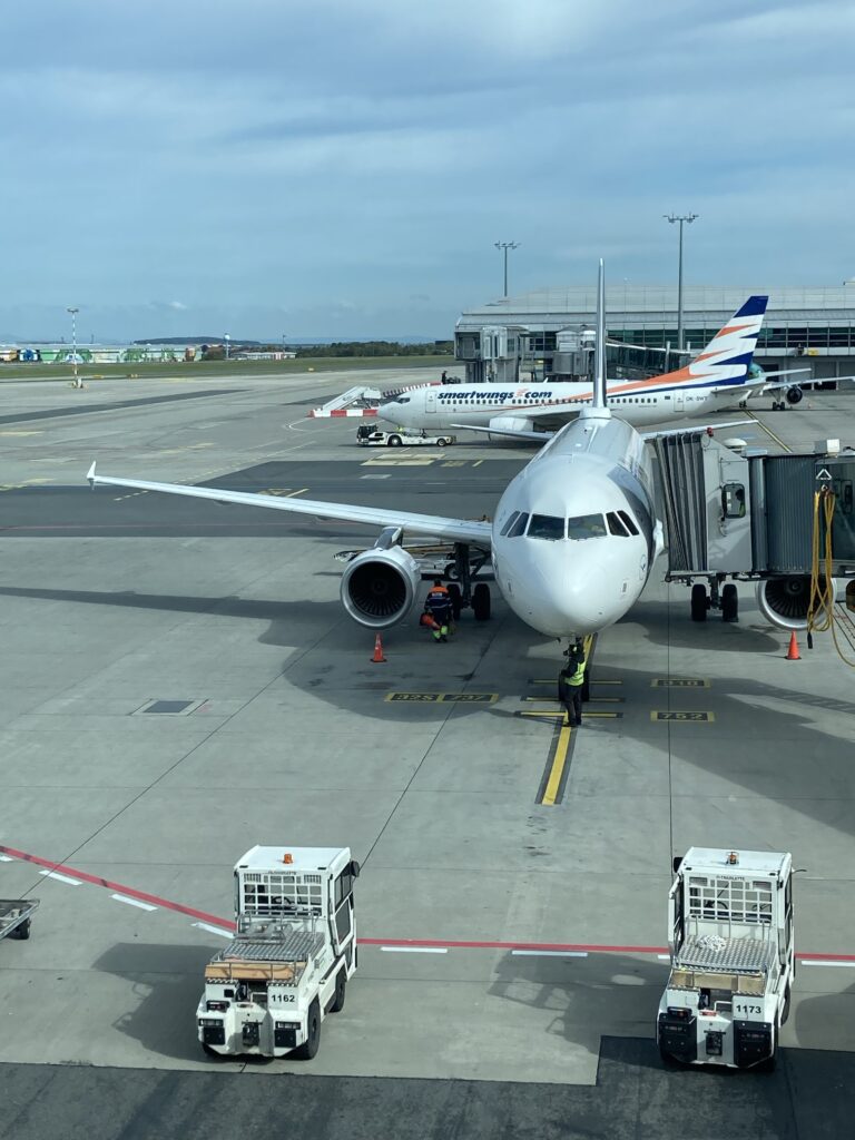 Flughafen Prag. Parkhaus. In die Lücke bekomm ich den Hobel gerade so. Und jetzt? Durch die Heckklappe aussteigen? Hm.